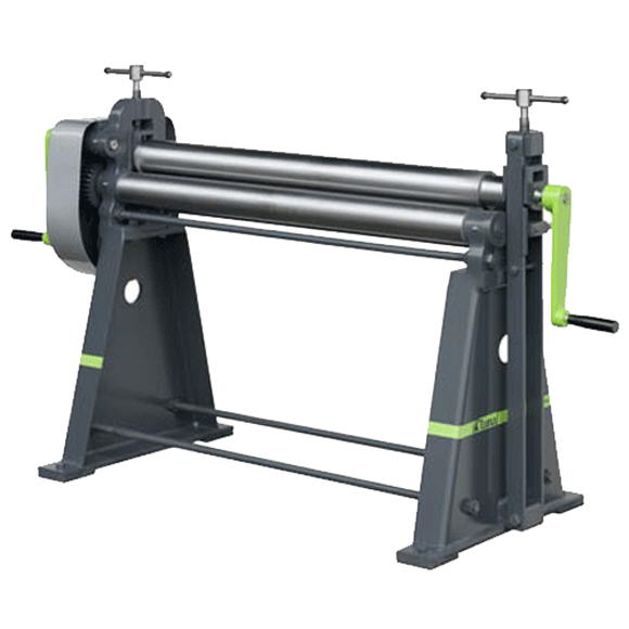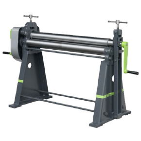 Die Rundmaschine Typ RH ist eine einfach konstruierte, stabile Maschine aus Gusseisen. Sämtliche Walzen sind ballig gedreht, wodurch ein Ausbiegen durch den Walzendruck verhindert wird und ein Biegen von gleichmäßigen Rundungen garantiert wird. (Bruchfestigkeit 700N/mm2). Die Unterwalzen sind fest gelagert. Die Oberwalze ist mittels zwei Schraubenspindeln schnell verstellbar und kann auch zum Konischrunden schräg gestellt werden. Ein Seitenbügel ist ausschwenkbar zur Entnahme von fertigen Werkstücken. |